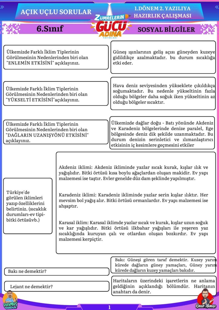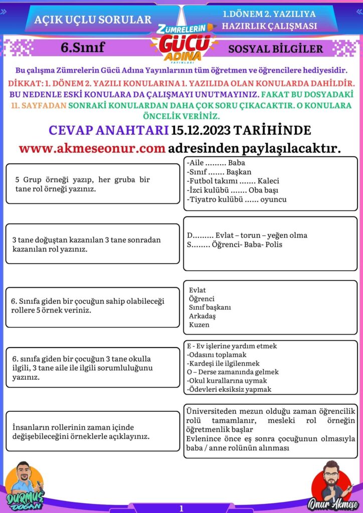 6. sınıf yazılıya hazırlık çalışmasının cevap anahtarının devamı